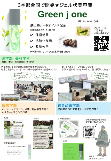 化粧水と乳液の機能を兼ね備えたオールインワンジェルで、埼玉県特産品である狭山茶の種から抽出した狭山茶シードオイル(チャ種子油)が配合されています。チャ種子油は、皮膚の水分、油分を補い保ち、皮膚をすこやかに保ちます。サラッとした質感なのに、保湿力が高い製品に仕上がりました。朝・晩のお手入れがこれ1本で解決!城西大学薬学部薬科学科、経営学部 辻ゼミ、現代政策学部 真殿ゼミの学生達が連携して作った製品、是非お試し下さい。